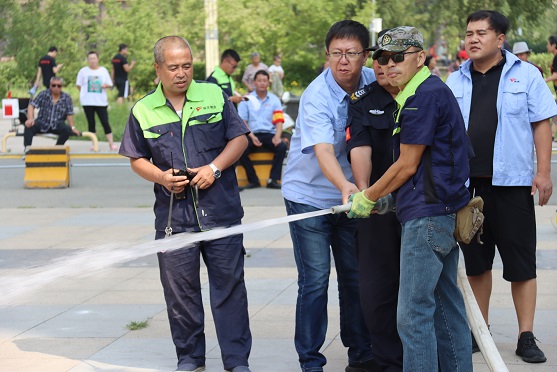 在快速啟動消防栓,連接消防水帶場景模擬中,參與演練的工作人員,動作敏捷,安裝準確,配合有序,第一時間消滅火情。