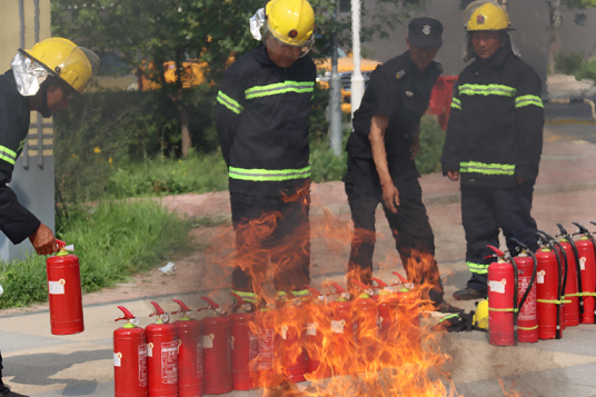 項目處經(jīng)理李銳詳細介紹了四公斤手提干粉滅火器的使用方法和注意事項。隨著第一著火點煙感報警器的預警聲,各組人員統(tǒng)一指揮,高效協(xié)調,臨危不亂,在實戰(zhàn)中鍛煉了火場組織疏散程序以及火場逃生、自救互救、搶險滅火的能力。