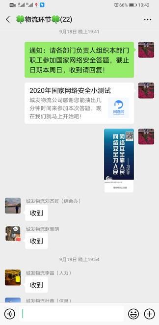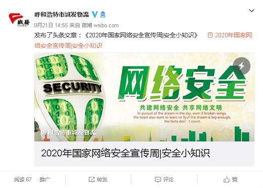 9月14日至20日,根據(jù)城發(fā)公司2020年國家網(wǎng)絡安全宣傳周實施方案要求,城發(fā)物流公司組織全體黨員干部職工積極開展2020年國家網(wǎng)絡安全宣傳周系列活動。