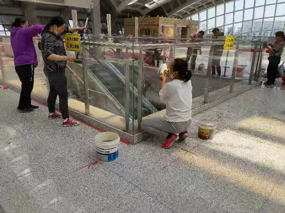 由于東客站長時間閑置導致站內(nèi)外車道、廣場雜草叢生,站內(nèi)通道、大廳地面及辦公區(qū)域灰塵堆積。由于啟用時間緊、作業(yè)面積較大,城發(fā)物業(yè)公司立即組織人員、機械設備、物料用品,次日一早,工作人員入場保潔,從門前車道、廣場除草、噴藥到建筑外立面玻璃擦拭;從站內(nèi)地面、辦公區(qū)域清潔到客車入站處場地及道路沖洗,隨處都能看到工作人員的身影。原本需要一周的工作,在工作人員的不懈努力下,僅用三天就完成了集團公司安排的保潔工作任務。使保潔面積2.3萬平米的現(xiàn)場面貌煥然一新,具備了投入使用的條件,也體現(xiàn)了物業(yè)公司能打硬仗、敢于攻堅的企業(yè)精神。