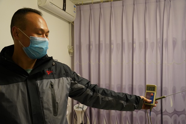 在20號(hào)樓3單元6樓的住戶家中,劉婷用手摸了摸用戶家的地板磚,通過人體的直觀感受,發(fā)現(xiàn)用戶家地暖存在散熱不均勻的現(xiàn)象??头芗矣脤I(yè)的測溫儀和熱成像儀,進(jìn)行了測溫。經(jīng)檢測,該用戶家各房間平均溫度均在23℃以上。用戶說,家中較冷的房間是廚房,客服管家又針對(duì)廚房進(jìn)行了測溫,發(fā)現(xiàn)室溫要比其他房間溫度低一些,但熱成像儀測得的結(jié)果與其他房間一致。經(jīng)過觀察與分析,發(fā)現(xiàn)用戶家廚房與陽臺(tái)間的隔斷是一扇落地大玻璃門,保溫效果較差,導(dǎo)致廚房溫度低于其他房間。聽了工作人員的講解,用戶也表示了認(rèn)可,對(duì)我們的排查結(jié)果及服務(wù)態(tài)度表示滿意。