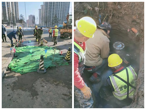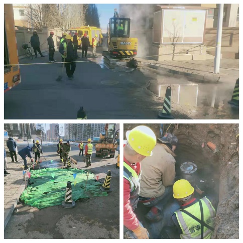 大年初二這天早上,富泰熱力公司巴彥分公司廠區(qū)門口路面滲水,疑似一次網(wǎng)發(fā)生跑水。得知這一情況后,分公司檢修所工作人員在對(duì)跑水位置進(jìn)行初步判斷后,立即聯(lián)系了安裝分公司。嚴(yán)陣以待的安裝分公司搶修隊(duì)員第一時(shí)間趕往現(xiàn)場(chǎng),發(fā)現(xiàn)現(xiàn)場(chǎng)有配電箱,地下有電纜、天然氣管,機(jī)械開挖比較危險(xiǎn),于是人工對(duì)路面進(jìn)行開挖,進(jìn)一步尋找漏點(diǎn)。經(jīng)過查找,發(fā)現(xiàn)是一次網(wǎng)上一個(gè)50抽頭發(fā)生跑水,他們不顧刺骨寒風(fēng)帶水作業(yè),給抽頭焊接了一個(gè)150的套管,又在套管上安裝了一個(gè)150的法蘭球閥,等做好保溫回填地面后,已經(jīng)是第二天凌晨4點(diǎn)了。大年初五,安裝分公司又接到了左右城小區(qū)跑水搶修任務(wù)。由于施工難度較大,搶修隊(duì)員們一刻不停歇的干了一天才完成任務(wù),及時(shí)恢復(fù)了供暖。