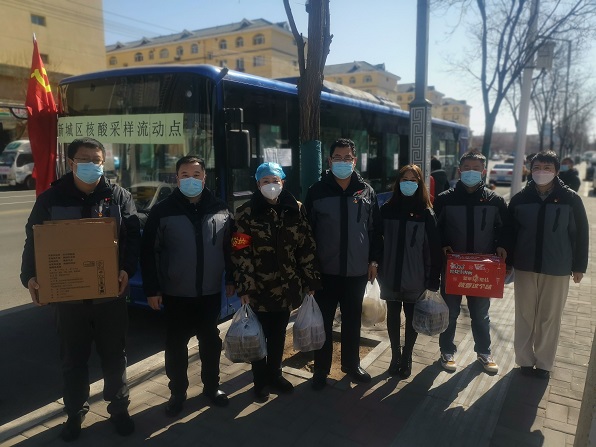 在核酸檢測(cè)現(xiàn)場(chǎng),大家還看望了下沉到該社區(qū)擔(dān)當(dāng)防疫志愿者的物業(yè)公司黨支部書(shū)記娜仁同志,此刻的她正身穿防護(hù)服全神貫注地為排隊(duì)等候的居民逐一掃描、錄入身份證件信息。在中間休息的片刻時(shí)間,娜仁同志為大家簡(jiǎn)單介紹了此處疫情防控的最新情況、防控要求及工作人員的配備、交接班制度及用餐作息等情況。她深有感觸地說(shuō):"社區(qū)的工作人員、志愿者們每天都很辛苦,厚重且不透氣的防護(hù)服一穿就是七個(gè)多小時(shí),中間不吃不喝,更不能上廁所,但大家都憑著堅(jiān)強(qiáng)的毅力堅(jiān)持了下來(lái)。每當(dāng)脫下厚重的防護(hù)服,大家都感覺(jué)渾身像散了架一樣,只想著立刻吃上一口熱乎飯,躺下來(lái)好好睡一覺(jué)。在這樣的持續(xù)堅(jiān)守下,大家卻毫無(wú)怨言,因?yàn)樗齻冎雷约杭缲?fù)的責(zé)任和使命是多么光榮和神圣。"她鼓勵(lì)前來(lái)慰問(wèn)的同志們,在此次抗擊疫情的非常時(shí)期,公司全體黨員要充分發(fā)揮好一個(gè)黨員就是一面旗幟的作用,在做好本職工作的同時(shí),積極參加到社區(qū)疫情防控的隊(duì)伍中,去做些力所能及的事,為社區(qū)筑牢織密疫情防線貢獻(xiàn)力量!