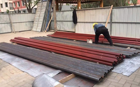 在如意小區(qū)A區(qū),材料現(xiàn)場(chǎng)工人們正在粉刷防腐漆,7號(hào)樓正在拆除單元立管;在如意小區(qū)B區(qū)和C區(qū),工人們正在拆除3號(hào)樓的單元立管,在現(xiàn)場(chǎng)看到拆下來(lái)的一段舊管,腐蝕非常嚴(yán)重,保溫層已完全沒(méi)有了,防腐漆分化了,一動(dòng)就一片片掉下來(lái)了。
