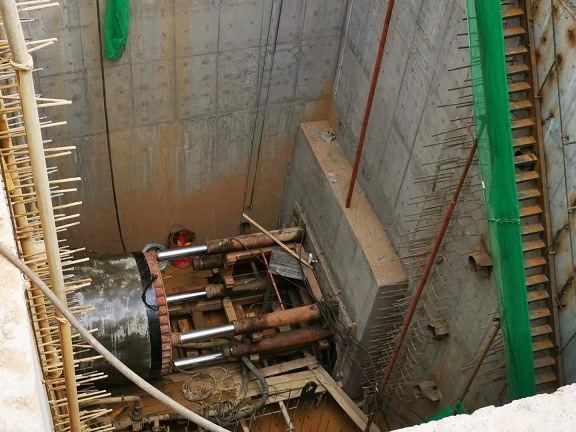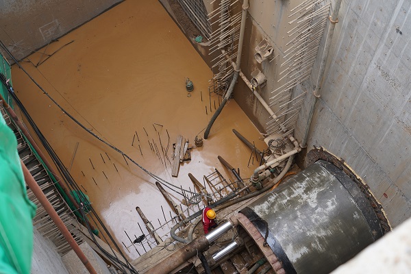施工現(xiàn)場(chǎng)機(jī)器轟鳴,說(shuō)話(huà)需要提高分貝。一進(jìn)入施工現(xiàn)場(chǎng),就看到前方有一個(gè)沉井,沉井20米深、13.4*7.3米間方,這個(gè)沉井是挖掘井,在河的對(duì)岸還有一個(gè)深15.5米的接收井。從沉井圍欄邊看井底,下邊的工作人員都顯得特別的渺小,20米深的井相當(dāng)于6層樓高,恐高的人都不敢往下看。