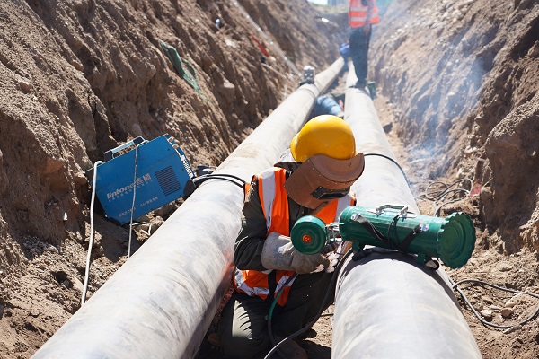 一個(gè)工人師傅,側(cè)身躺在兩個(gè)管道中間的狹小夾縫中,對管道進(jìn)行焊接。施工單位天津管道公司的段步雨向筆者介紹,"現(xiàn)在這個(gè)師傅做的是第二道工序,叫電焊造面。你看到這么長的管子,都是一截一截焊接起來的,焊接要兩道工序,第一道是氬弧焊打底,就是在電弧焊的周圍通上保護(hù)氣體----氬氣,使焊材不能和空氣中的氧氣接觸,從而防止了焊材的氧化,所以第一遍要用氬弧焊,就是為了焊口不生銹,確保它的使用年限。氬弧焊完成后,為了管道外壁齊平,焊口更牢靠,再進(jìn)行第二遍電焊造面。"