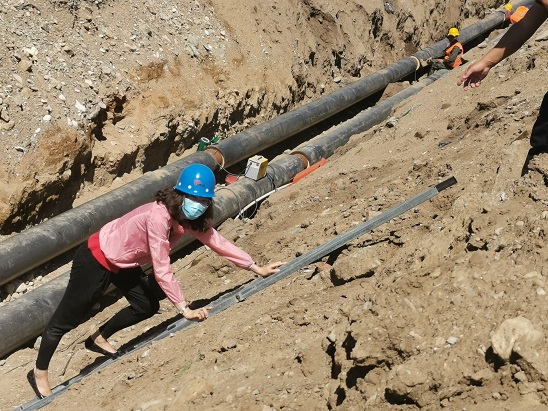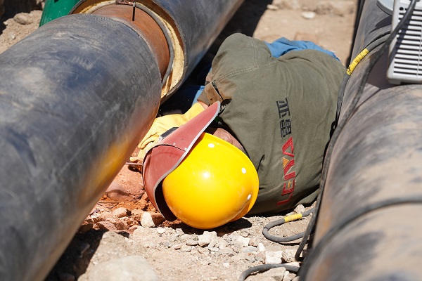 剛到現(xiàn)場,眼前是一大片比人還高的土堆,跟著現(xiàn)場的工作人員,繞著土堆走了大一圈,才看到了5米多深的管溝。當(dāng)天正是二十四節(jié)氣中的小暑,雖然在前兩天剛下過一場大雨,但絲毫沒有消減半分暑氣,但是溝內(nèi)的工人們,沒有因?yàn)樘鞖庋谉岫麡O怠工,按照安全生產(chǎn)的著裝要求,頂著毒辣的太陽,全副武裝、緊鑼密鼓地干著手中的活。豆大的汗珠順著他們黝黑的臉不停的滴落,但他們似乎完全沒感覺到。
