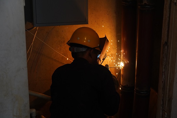 上午9:30時,直播組來到開天花園北區(qū)1號樓前,小區(qū)供熱主線的管溝內(nèi),一工人師傅穿著長褂,帶著手套在狹小的空間內(nèi)正嫻熟地進(jìn)行焊接,飛濺的火花下面,看不清楚他的臉,待焊接完一段后,他取下電焊面罩,露出一張黑紅黑紅的臉,汗水順著額頭直瀉而下,汗珠吧嗒吧嗒流在眼里、滴到了地上,不時用衣袖擦眼睛。他告訴筆者,地面溫度是36°,他焊接的周邊溫度要達(dá)到50多度。面對高溫的"烤"驗(yàn),他全然不顧,用他的話說:這是他們的工作常態(tài),早已習(xí)慣。