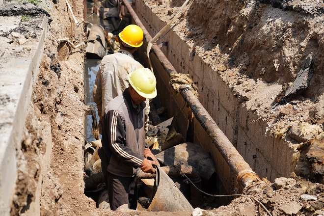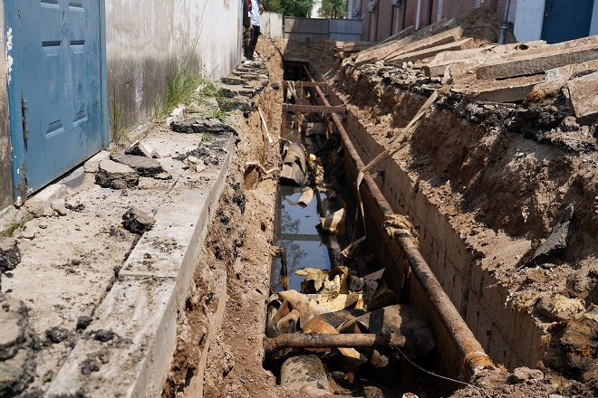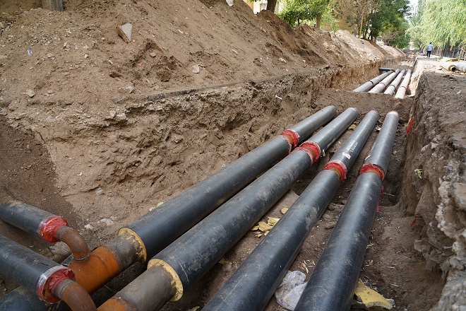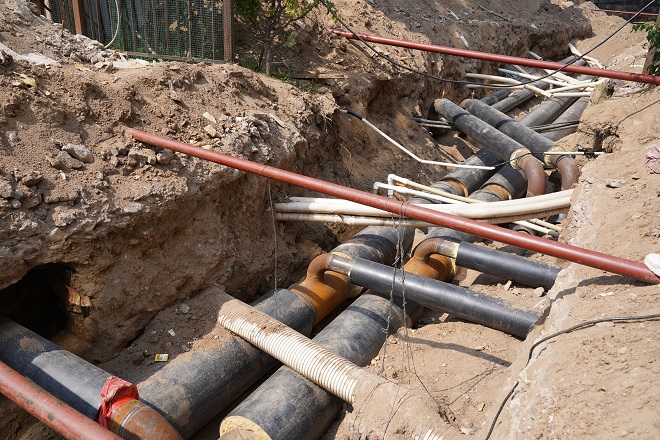在開天花園小區(qū)熱力站供熱管線出口區(qū)域,兩名工人師傅正在清理現(xiàn)場的供熱管線?,F(xiàn)場看到管溝內(nèi)鋪設(shè)的主管線、與樓宇的抽頭安裝已全部完工,溝內(nèi)自來水管線、污水管線、弱電管線、強(qiáng)電管線縱橫交錯。