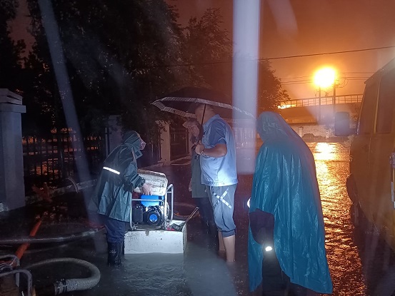為應(yīng)對強降雨天氣,8月13日早8時,橋靠分公司黨總支部書記趙怡春、分公司副經(jīng)理陳龍帶隊來到包聯(lián)小區(qū)呼哈路社區(qū)鐵木真小區(qū),全力維護小區(qū)的防汛工作。