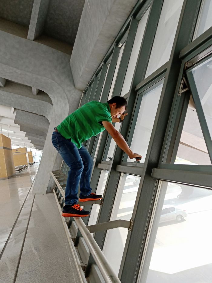 主站樓部分是攻堅之戰(zhàn),30位員工在透明的頂棚下感受悶熱灼曬、揮汗如雨,每一塊地磚都是經(jīng)過了水沖、塵推、除塵、清洗、抹凈、擦干等六道工序,方可達標(biāo)。上下兩層共26912平方米,經(jīng)過兩天半的時間終于完工,看著光亮如新、纖塵不染的候車廳,所有員工的臉上都綻放了發(fā)自內(nèi)心的微笑。